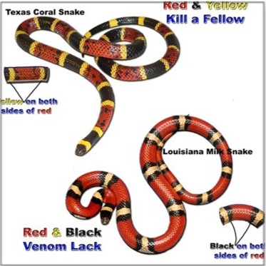 The Boy Scouts have a witty rhyme for identifying the colorful but venomous coral snake. It’s benign cousin, the milk snake, mimics it’s colors to fool other critters and predators in the wild.